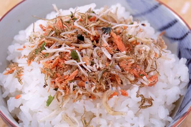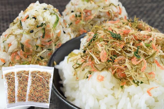 〇原材料名:鮭フレーク(鮭(北海道産)、食塩)、ごま、ツノナシオキアミ、調味野沢菜(野沢菜、食塩、砂糖、ぶどう糖)、ちりめん、調味昆布(昆布、醸造酢、還元水あめ)、鱈すり身加工品(鱈、小麦澱粉、その他)/調味料(アミノ酸等)、ソルビット、酒精、着色料(紅麴、カロチノイド、コチニール、クチナシ)、(一部に小麦・ごま・鮭・大豆・ゼラチンを含む)